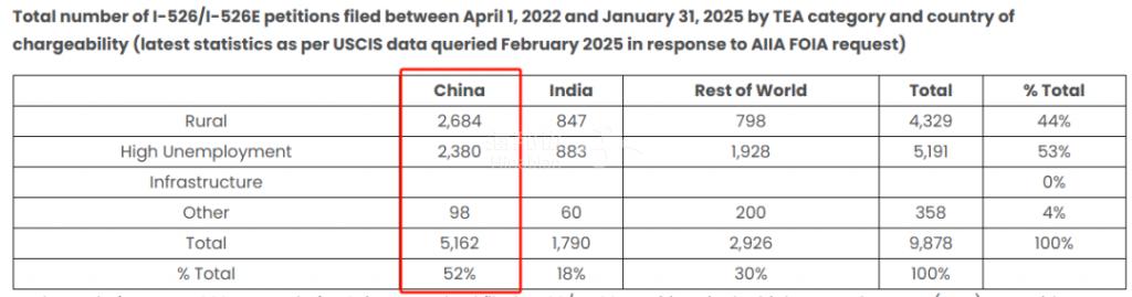 近日,AIIA(美国投资移民联盟)从美国移民局获得了一份新数据,包括了2022年4月至2025年1月提交的9878份I-526和I-526E。这批最新数据包含了按TEA类别和国别划分的I-526及I-526E申请分布情况。