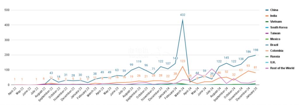 各国的申请趋势在2024年3月因申请费用上调引起的动荡之后开始趋于稳定,中国大陆和印度在最近几个月也恢复了各自的正常申请量。2024年3月后,世界其他国家的申请量也依旧保持强劲。
