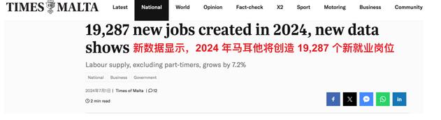 7月,据《马耳他时报》新数据显示,今年就业市场迎来了显著的增长,2024年新增就业岗位达19,287个。这一增长反映了马耳他经济的强劲和活力,以及政府在吸引外来人才和促进本地技能发展的成功政策。马耳他的失业率在欧盟国家中保持第二低,仅为2.8%,远低于欧元区平均水平。