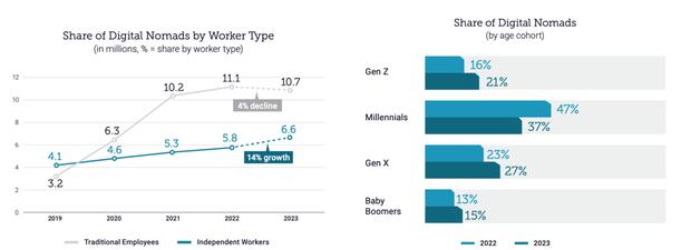 根据MBO Partners的报告,大多数数字游民(58%)都是年轻一代:Z 世代(21%)和千禧一代(37%)。Z 世代(1997-2012年出生)数字游民的快速增长是主要驱动力,在未来七年中,将有更多的Z世代加入数字游民大军。