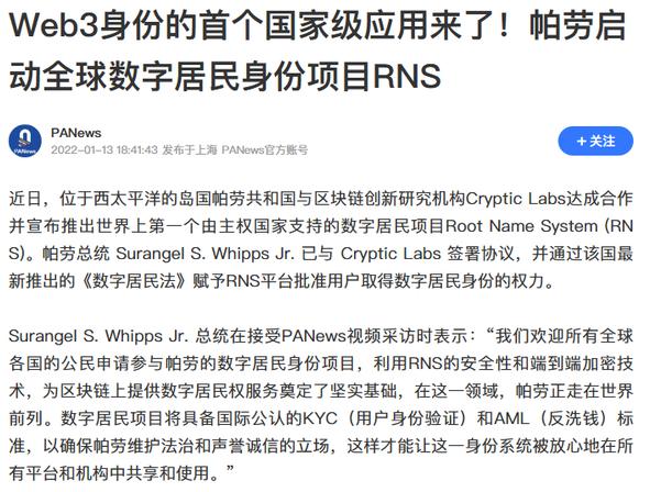 除此之外,让世界知名的就是Web3身份的首个应用,帕劳与区块链创新研究机构Cryptic Labs达成合作并且推出世界上初个由主权国家支持的数字居民项目Root Name System(RNS)。帕劳总统已经和该机构签署协议,并通过该国新推出的《数字居民法》赋予RNS平台批准用户取得数字居民身份的权力。