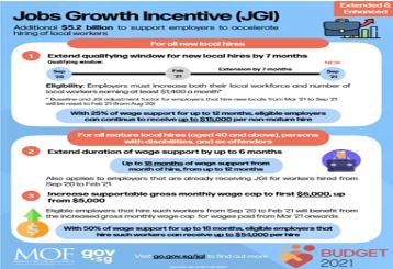 除了以上提到的商业补贴外,新加坡政府也从2020年9月至2022年9月宣布了高达52亿的招聘奖励计划(JGI)。此计划是针对在疫情期间雇佣新加坡本地员工的企业的补贴计划,以便为本地人创造良好和长期的就业机会。JGI将为每个非成熟的本地雇员提供12个月的工资支持,为每个成熟的雇员以及一些特殊雇员提供18个月的工资支持。